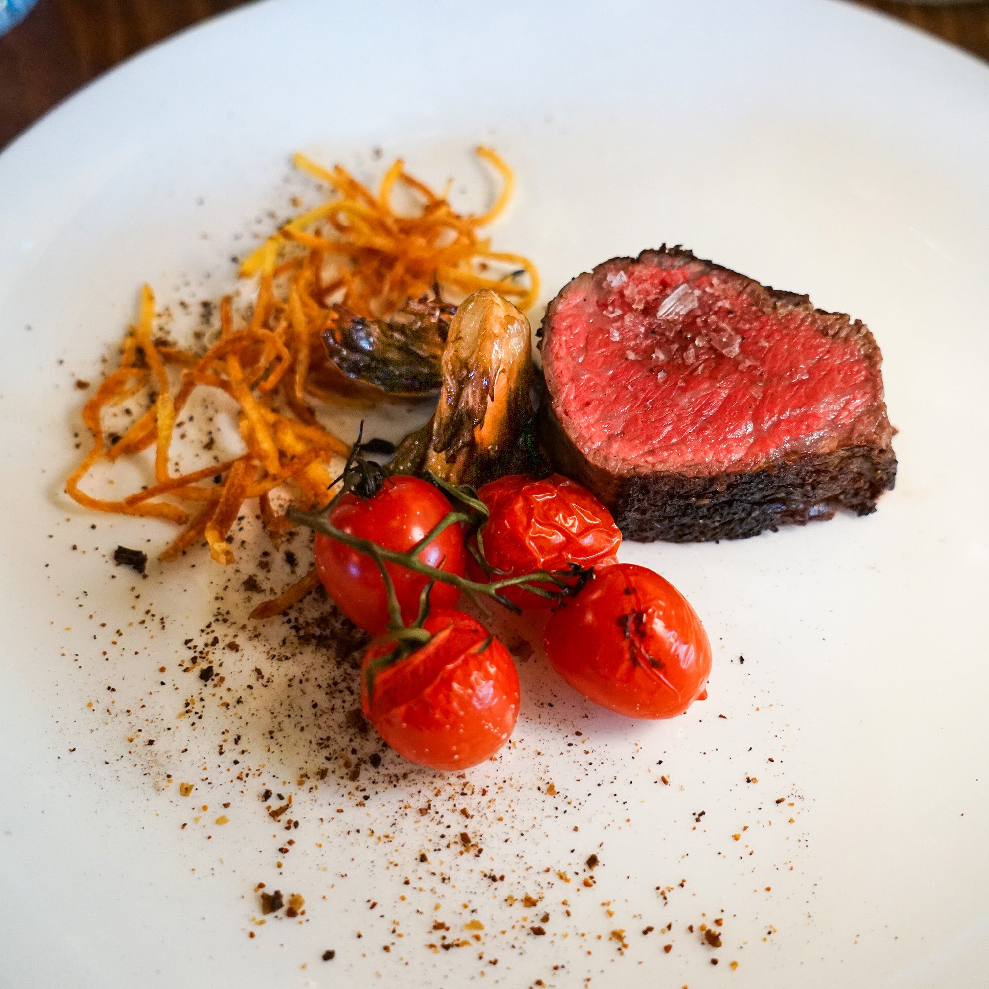 The centerpiece of the evening was the Kiwami by Kerwee Wagyu Strip, a decadent cut of beef that melts in the mouth. It was served with yukon potato hay, wild mushrooms, Maillard cippolini dust, and fire-roasted on-the-vine tomatoes. The dish’s richness was matched with the 2021 Rockpile Cabernet Sauvignon featuring dark, intense flavors of blackberry, cassis, and a hint of oak.